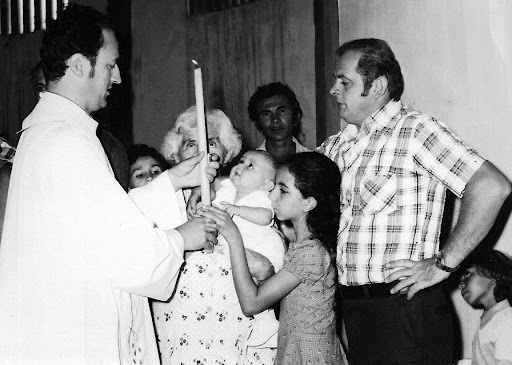 padre Alfredo Grosso batizando uma criança e pdre Mário Zanetta era o padrinho